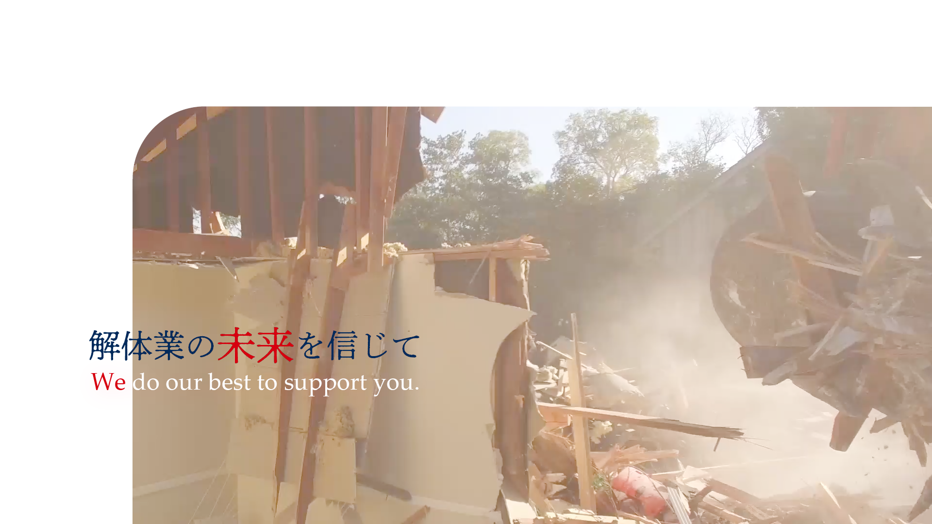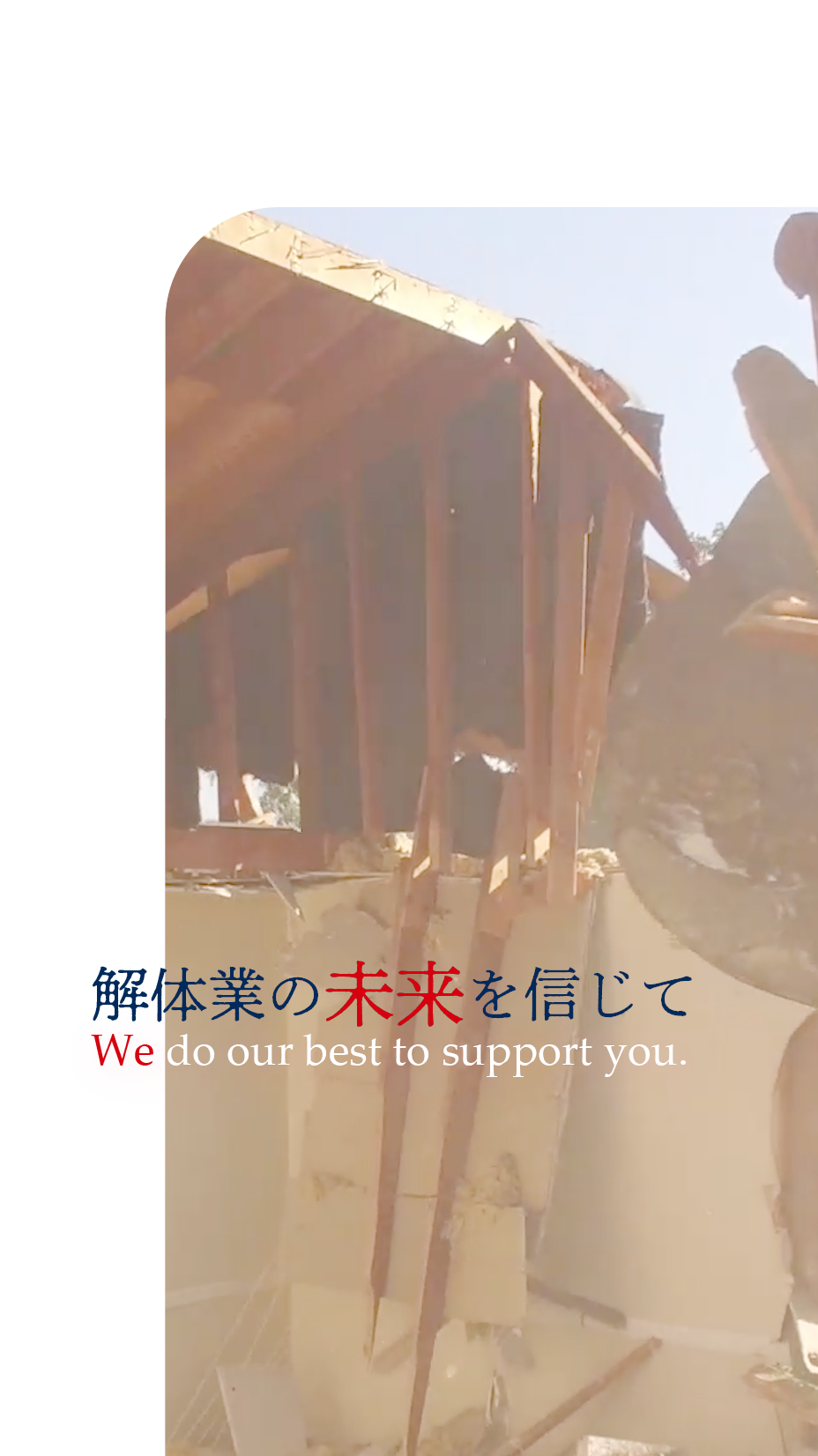 私たちは、○○市を拠点に、解体業を営む会社です。私たちは、長期にわたる信頼関係を築き、未来の街づくりに取り組んでいます。決して努力を惜しまず、一つ一つの作業に心を込めて取り組んでいます。お客様と共に成長し、より良い社会の実現に向けて邁進していきます。